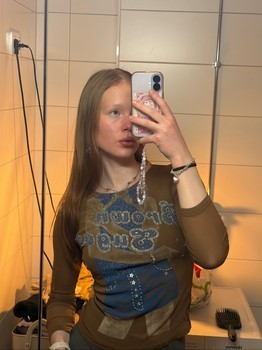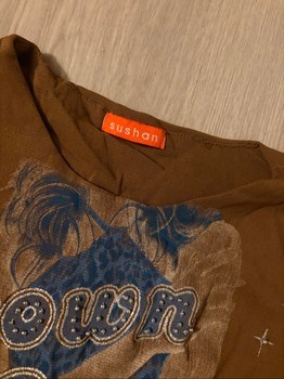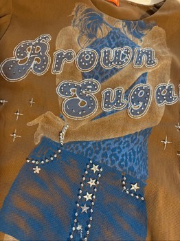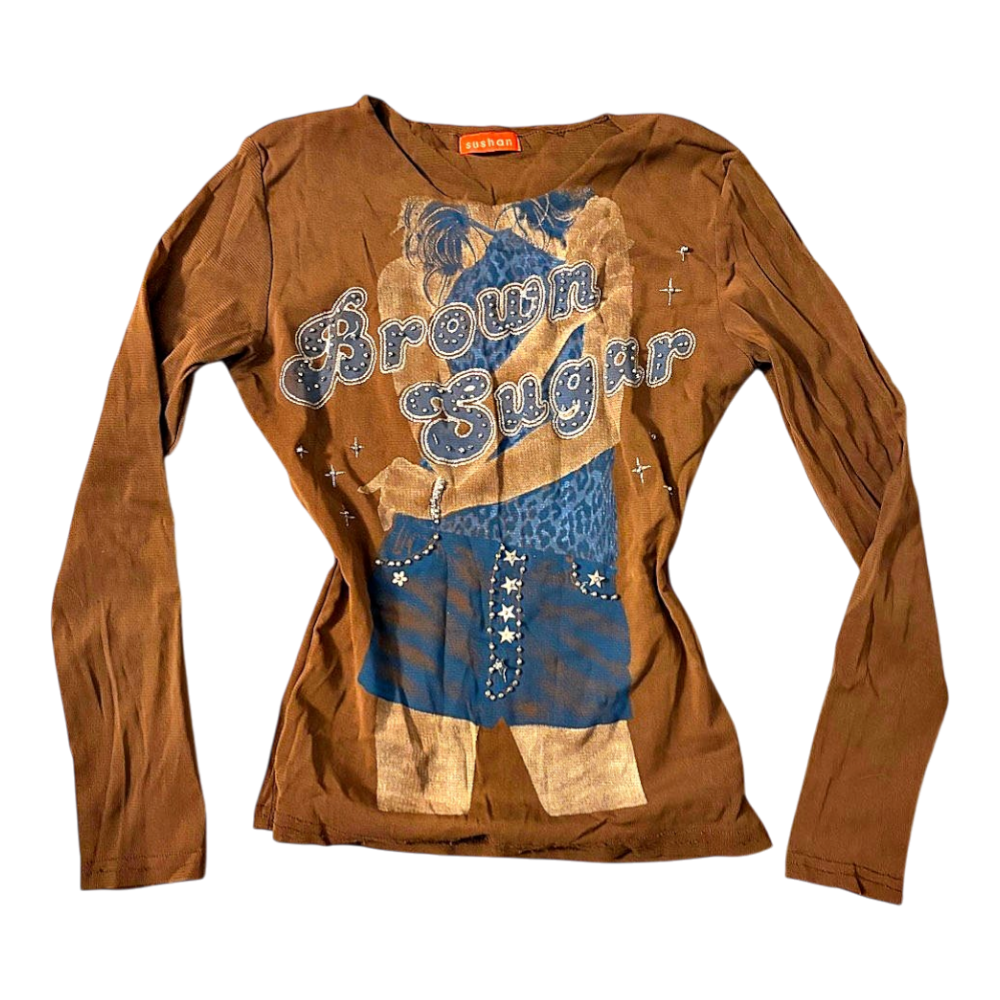 Brown long-sleeved top with a graphic print. Features 'Brown Sugar' text and blue and silver details. Fits S-M