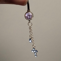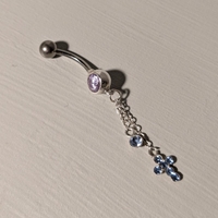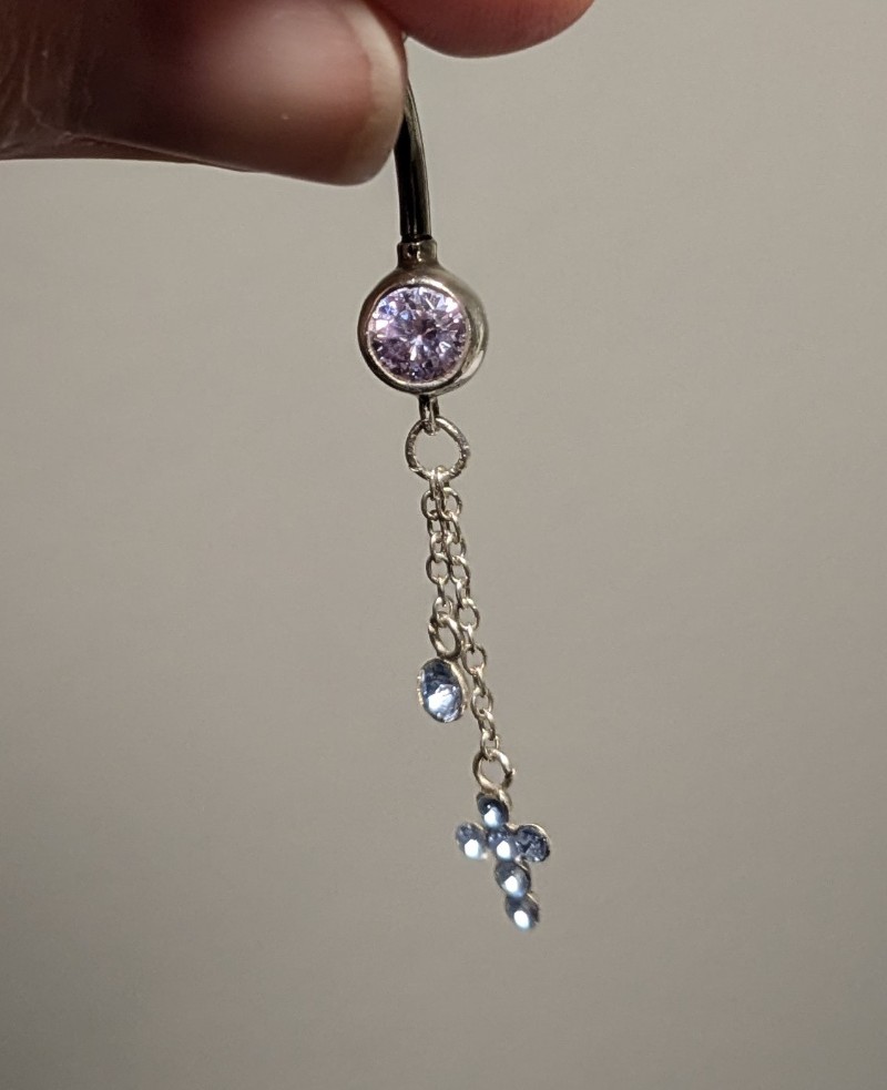 Bananabelli vaaleanpunaisella/-lilalla kivellä ja sinisin kivin koristelluilla riipuksilla. Pituus pallon alareunasta toiseen n. 1,1 cm. Ei tietoa materiaalista, paitsi kivipallossa hopean leima 925. Riipusosion olen joutunut kerran kiinnittämään uudelleen, josta renkaassa jälkiä. Kuvassa näkyvän aukon ristin kiinnitysosasta kiristin kuvan oton jälkeen.