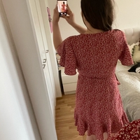 Kevyt minimekko kietaisumallilla, syvällä V-pääntiellä ja röyhelöisellä helmalla. Punaisella pohjalla valkoinen kukkaprintti. Säädettävä vyötärönauha imartelee vartaloa.
