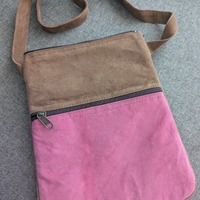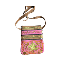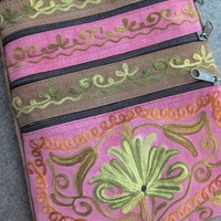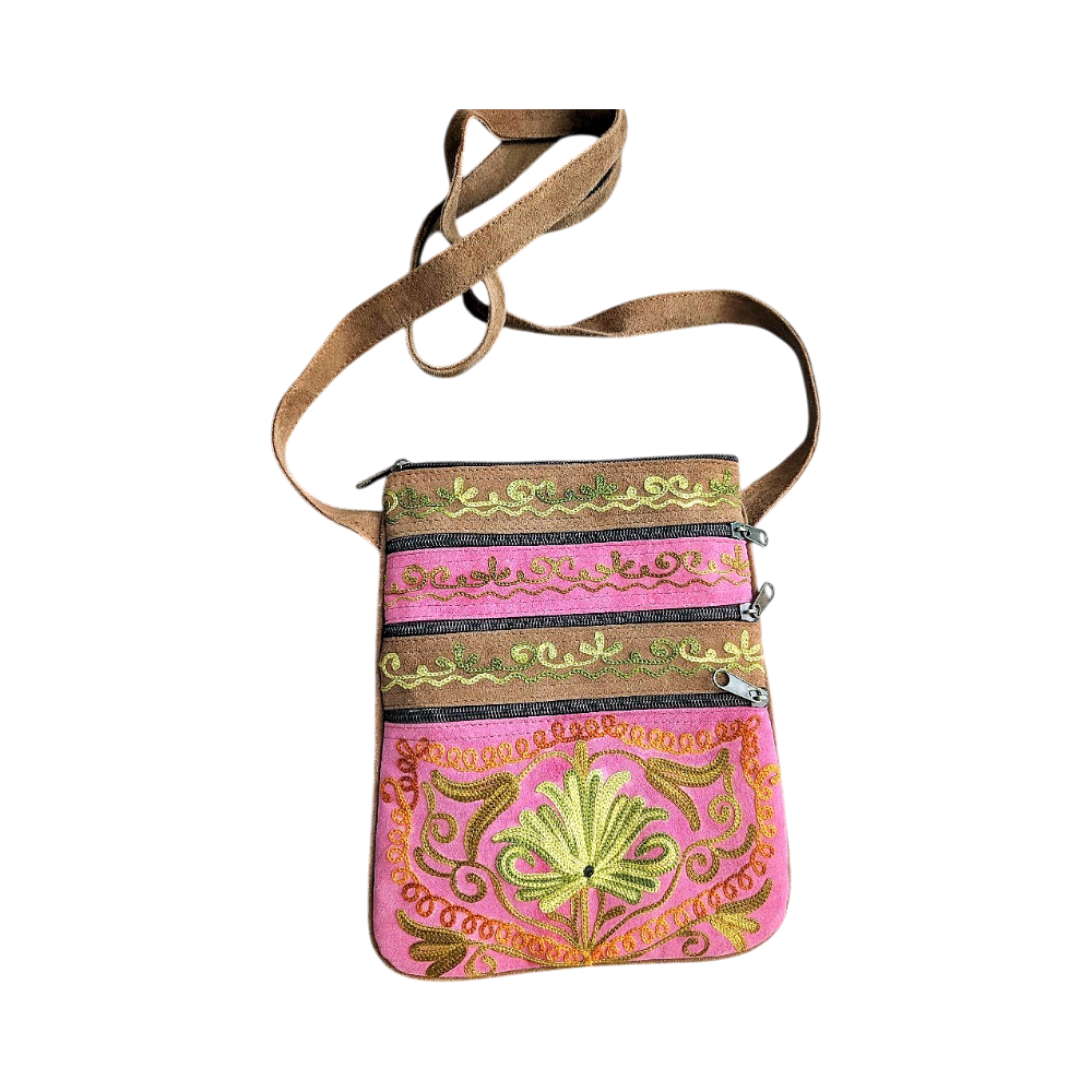 Brodeerattu olkalaukku, useita vetoketjutaskuja, ruskea ja pinkki