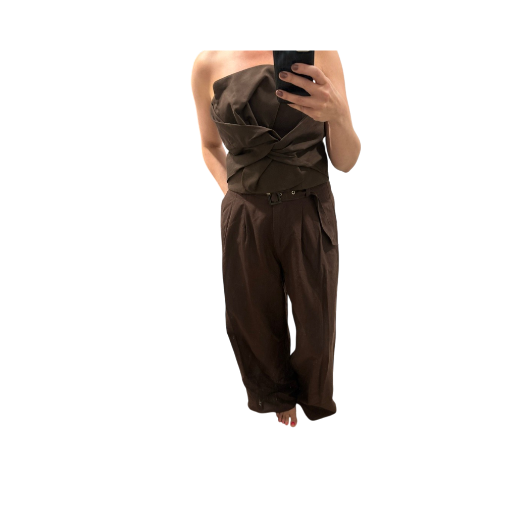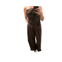 Upea ja tyylikäs comman Fusu Lindnerin suunnittelema asukokonaisuus mikä lanseerauksen jälkeen myytiin heti lähes loppuun. Laadukkaat paperbag-vyötäröllä, leveät lahkeet omaavat housut ja toppi missä takana venyvä kuminauhakaistale, silikoni pitää topin paikoillaan. Näyttävä kokonaisuus. Olen 170 ja minulle juuri sopiva mitta housuissa, menee myös lyhyemmälle koska asu on rento ja lahkeet saa olla pitkät.