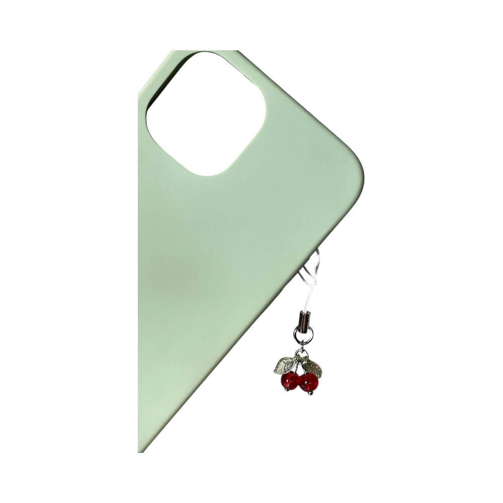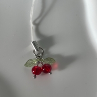 Söpö käsintehty kirsikkakännykkäkoru valkoisella narulla ja hopeisilla yksityiskohdilla🍒