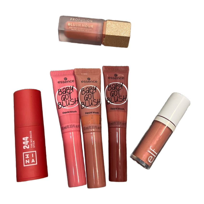 Useita nestemäisiä poskipunia settinä. Kaikkia käytetty vähän. ELF sävyssä dusty rose.