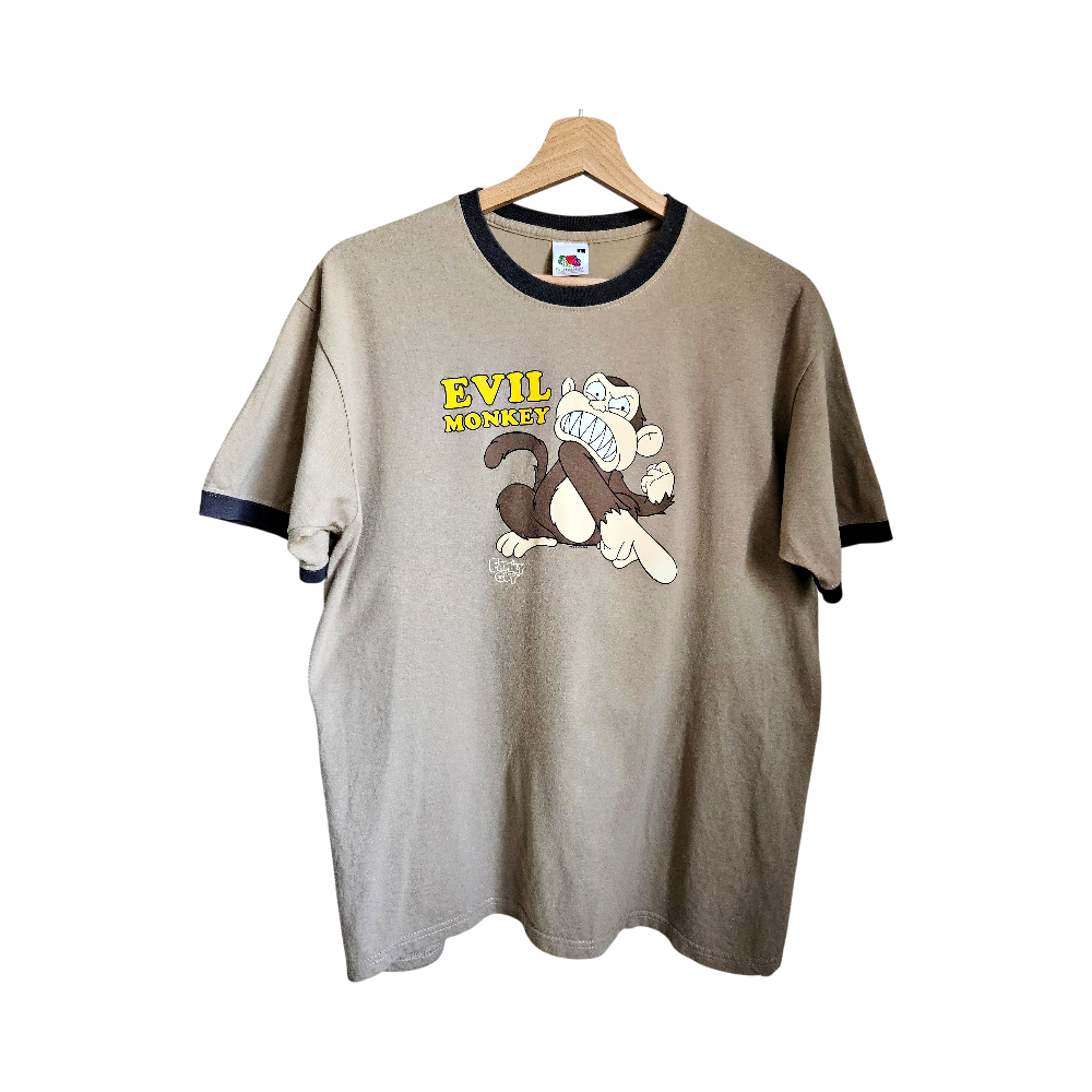 Fruit of the Loom, graphic t-shirt, ringer tee, Evil Monkey, cartoon print, Y2K fashion, 90s revival, retro tee, normcore style, ironic tee, indie sleaze, streetwear, casual style, unisex t-shirt, playful graphic, vintage inspired, everyday wear, relaxed fit