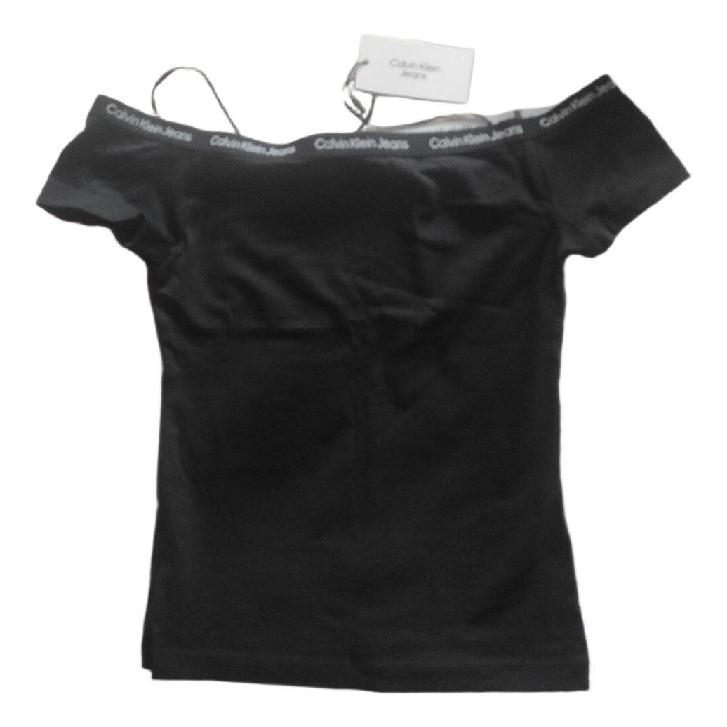 Black off-shoulder top from Calvin Klein Jeans. Features branded elastic trim. Size XS, new with tags.