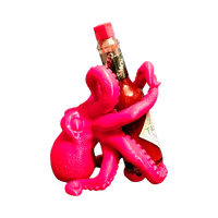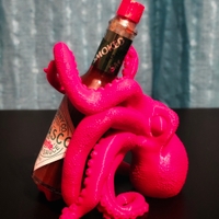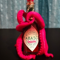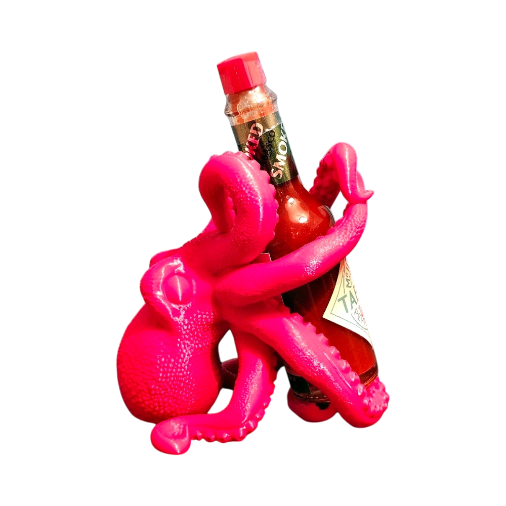 Söpö pieni mustekala joka pitää Tabasco pullon tallessa.