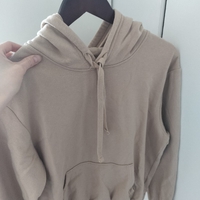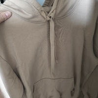 Beige värinen huppari, edessä tasku ja nyörit hupparissa.