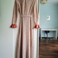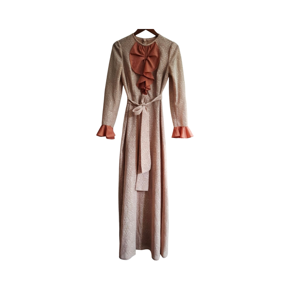 Long floral lace maxi dress with belted waist and ruffled cuffs and chest.