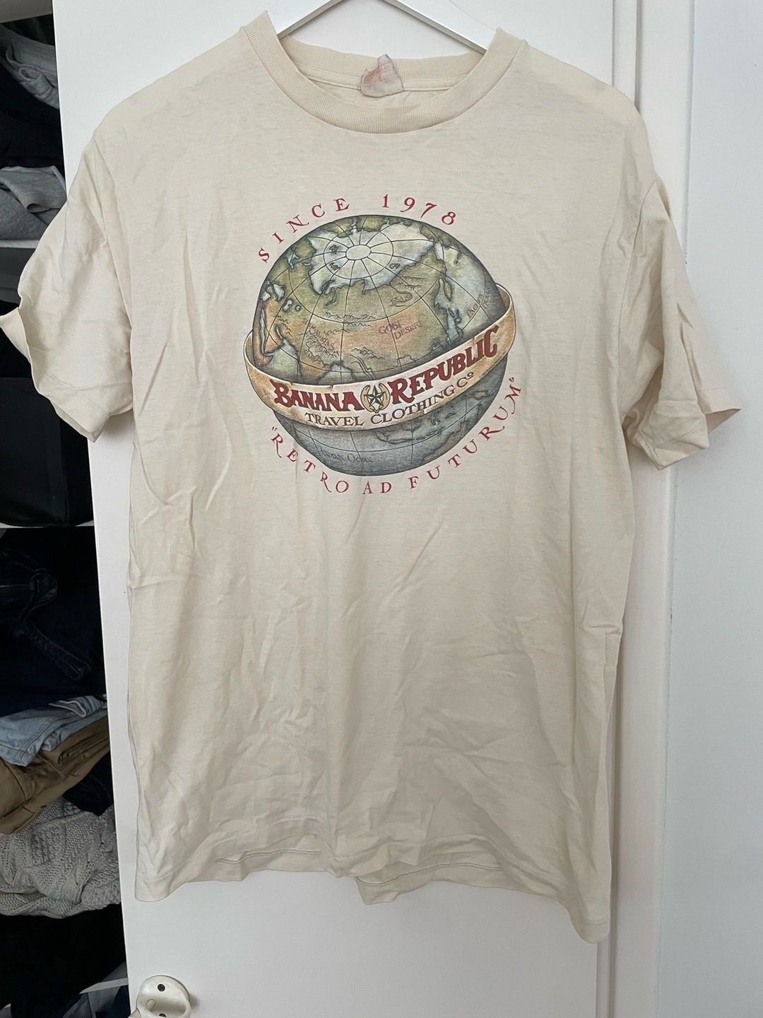 Second handina ostettu t-paita. Kokomerkintä on kulunut pois, mutta arvioisin, että reilu M tai pieni L. Materiaalista ei myöskään tarkkaa tietoa, mutta olen melko varma, että 100% puuvillaa