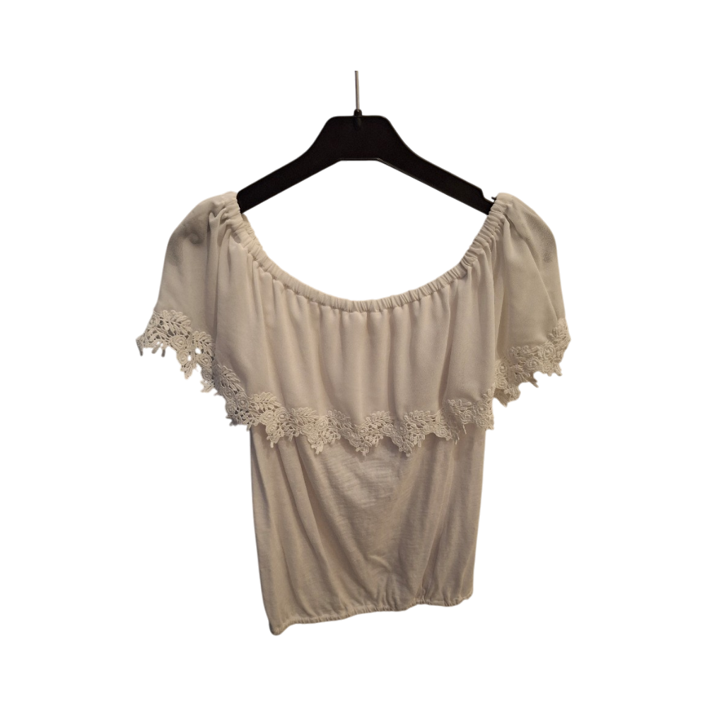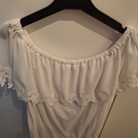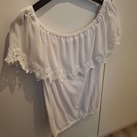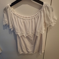 Off-shoulder pusero pitsireunuksella, joustava helma.Valkoinen