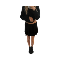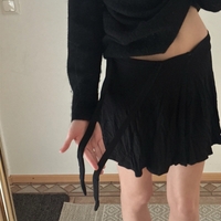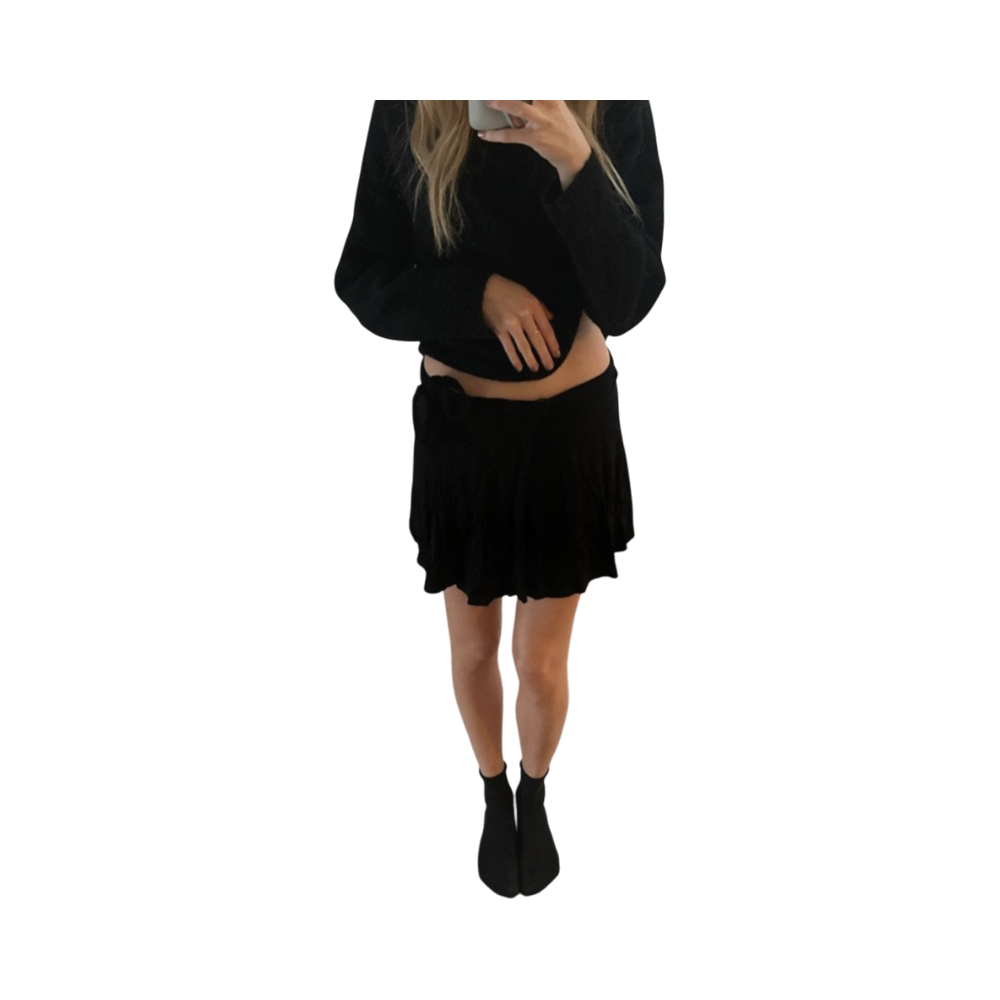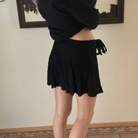 Flowy wrap-around mini skirt with tie waist, lightweight fabric.