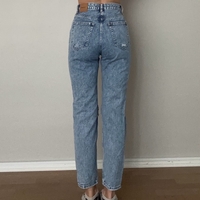 Trendy blue mom jeans with large ripped details on the legs. High-waisted and straight fit, easy to style with different tops. Size S / EU 36. In good condition, no stains or other wear – the rips are part of the design.