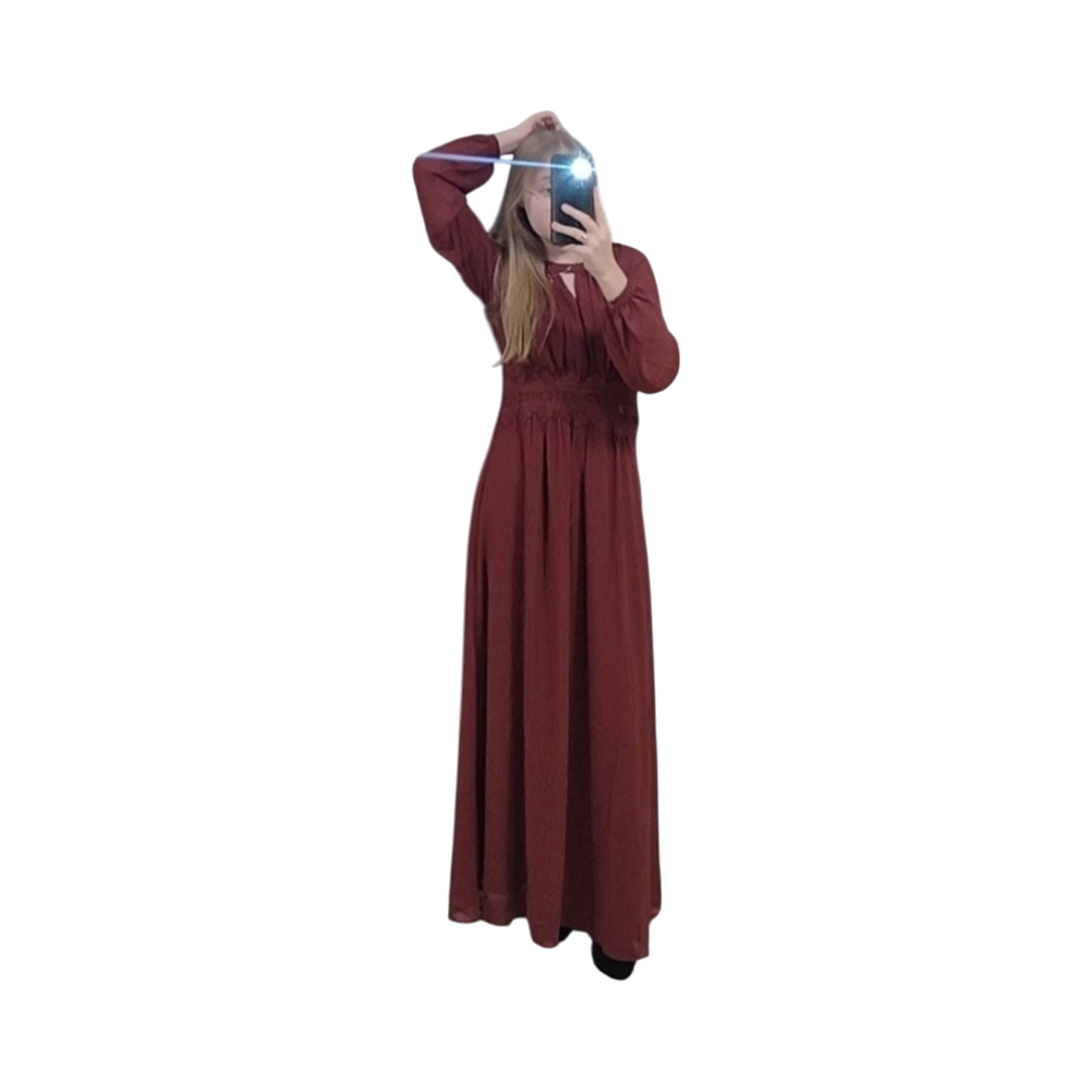 Pitkä, hihallinen mekko pitsivyötäröllä, hyväkuntoinen.