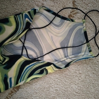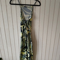 Pitkä mekko spagettiolkaimilla ja kuviollisella kankaalla. Kangas on venyvää eikä ainakaan itselläni näy läpi. Jäänyt kokonaan käyttämättä, eli kunto vastaa uutta.