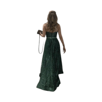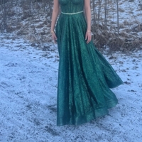 Vihreä paljettinen iltapuku, olkaimeton, pitkä helma. Tanssisin itse vanhoissa tällä mekolla.
