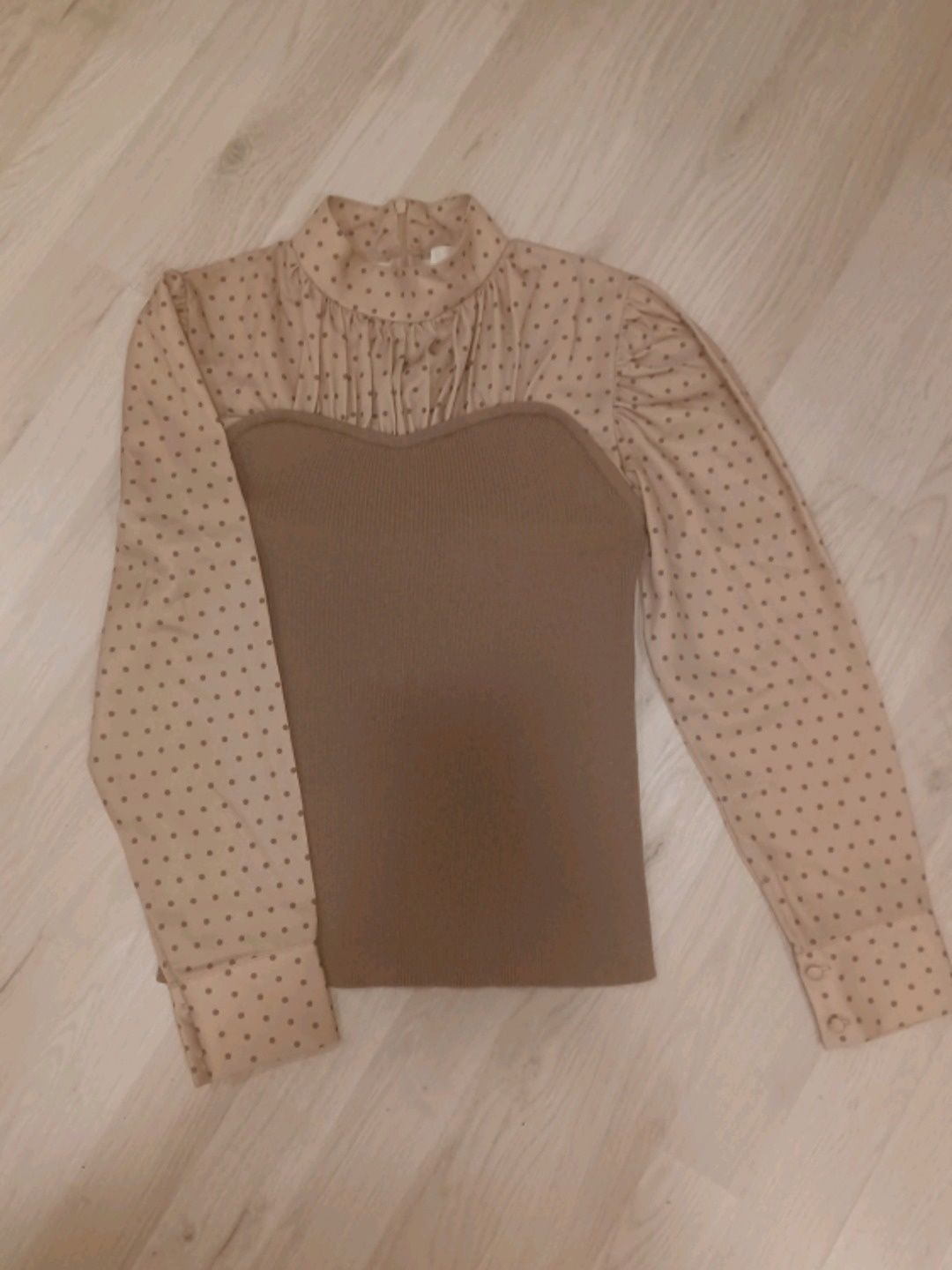 Ruskea pallokuvioinen neulepaita. Free size, vastaa n. xs tai pieni s, takana vetoketju. Toisen hihan ranteen ommel vähän irti, on helposti korjattavissa jos häiritsee ja on neulaa ja lankaa. Muita käytön merkkejä ei ole. Japanista tilattu, merkiltä Darich, ovh ollut n. 70€