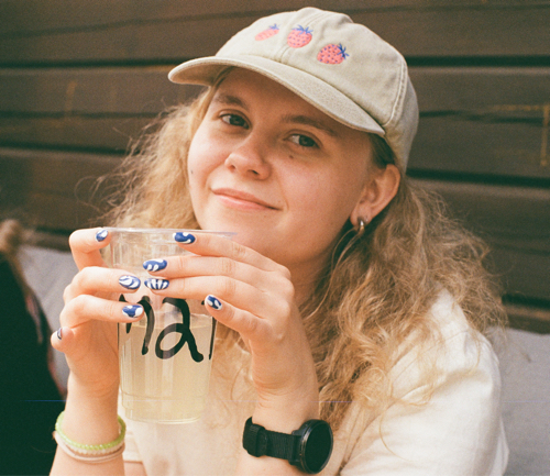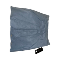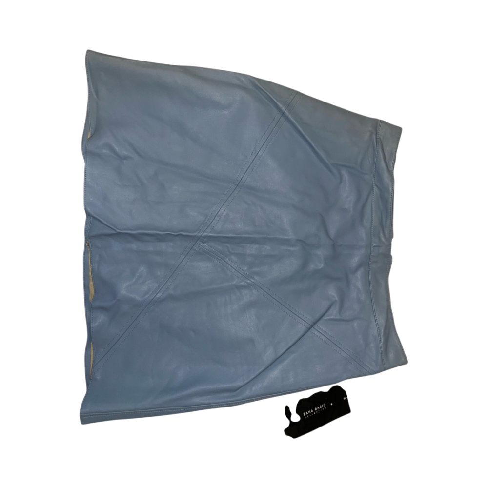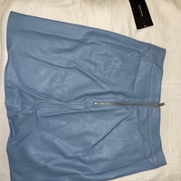 Lyhyt vaaleansininen nahkahame, vetoketjulla takaosassa. Lapussa M, mutta itselle hieman pieni.