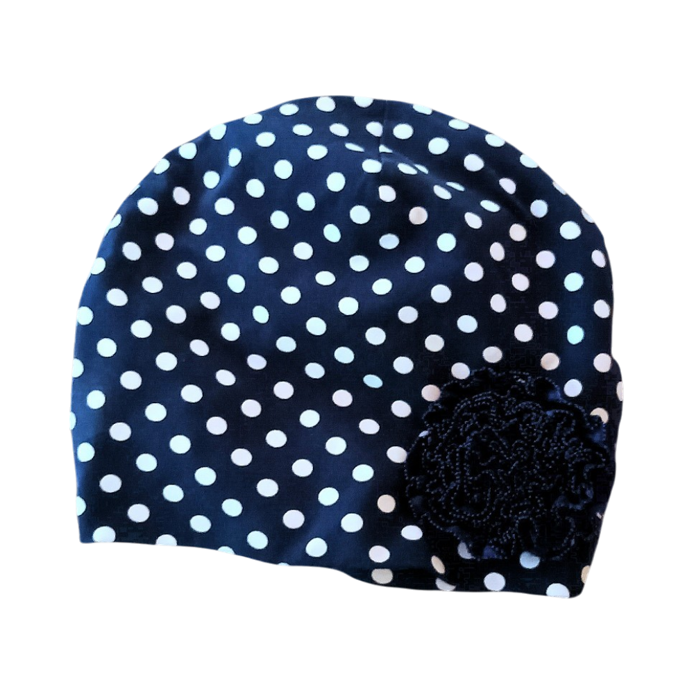 Musta valkoisin pilkkuin pipo, koristekukalla. Trikoota