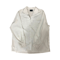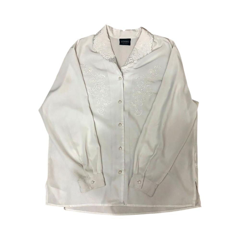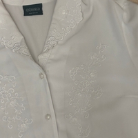 Elegant vintage white shirt with detailed embroidery and buttons.