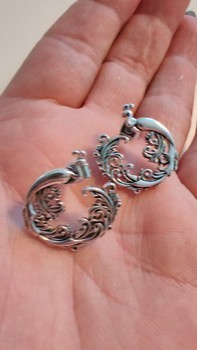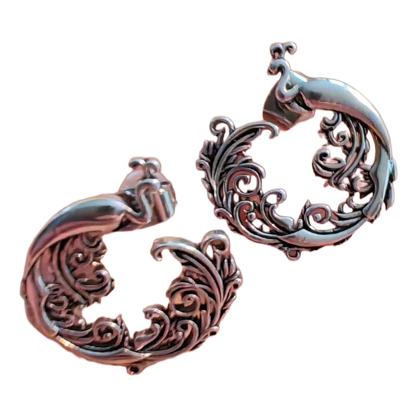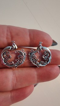 Yksityiskohtaiset hopeanväriset riikinkukko-aiheiset korvakorut.