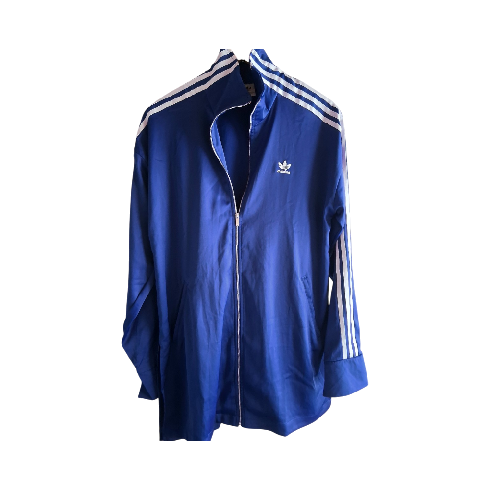 Sininen kevyt adidas-treenitakki, valkoiset raidat hihoissa.
