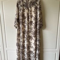 Kokopitkä mekko, 100% viskoosia, ohutta ja ilmavaa, väri vaalea beige, ruskea lehtikuviointi. Koko 44, pituus olkapäältä helmaan 140 cm , kai- kai 60 cm. Erillinen polvipituinen alusmekko . Ostettu Kekäleestä, OVH. 129,95e. Katso täältä: https://www.kekale.fi/part-two-naisten-mekko-berit-dress-beige-kuosi