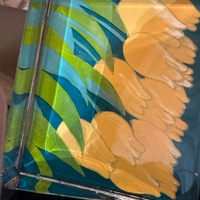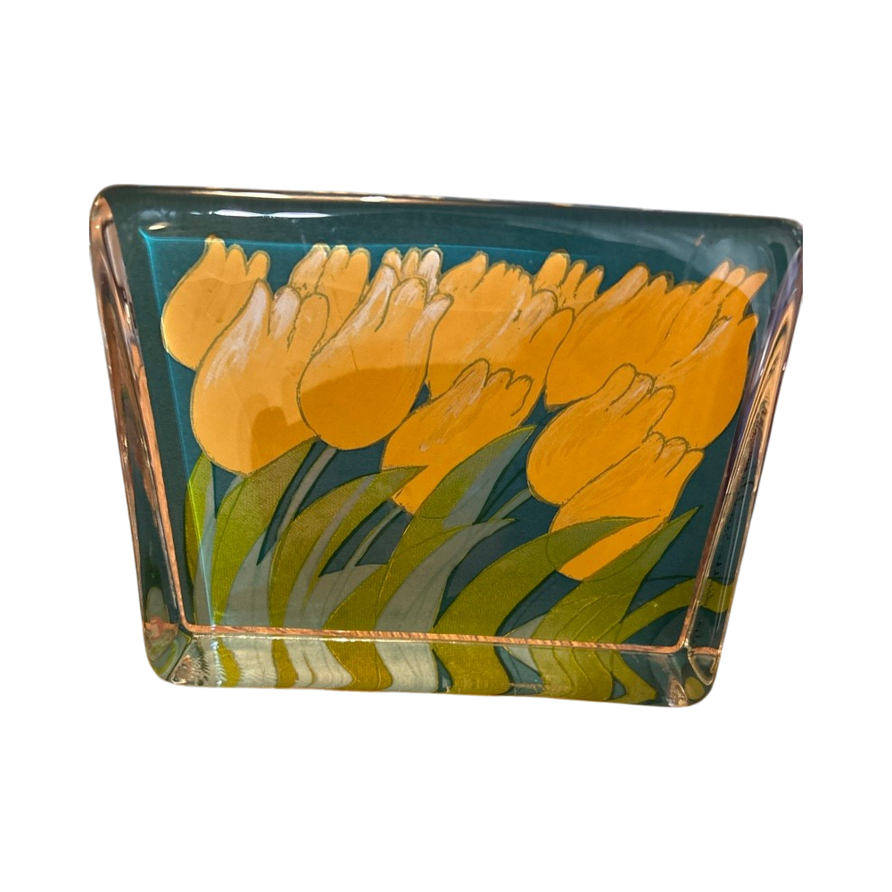 Kirkas lasivase keltaisin tulppaanikuvioin. Iittala Tulppaani Maljakko Kirkas lasi Keltainen Kukka-kuvio