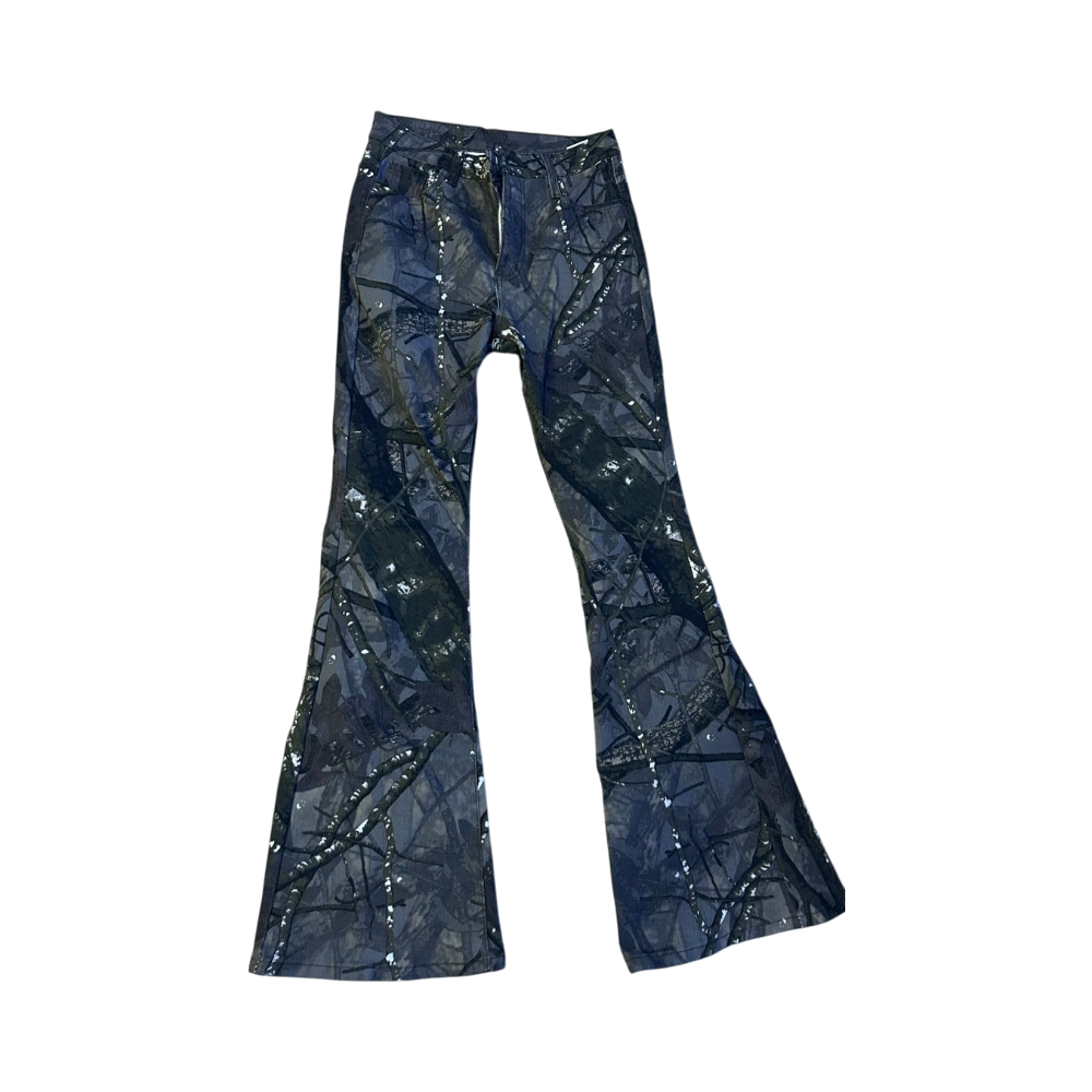 Vahva musta/harmaa oksakuvio, leveät lahkeet. Koko 160 vastaa xs kokoa
