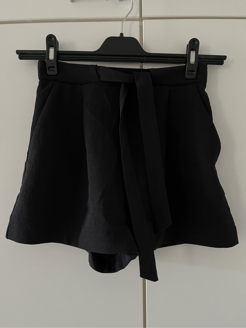 Mustat korkeavyötäröiset shortsit koossa 34. Sivuilla taskut, edessä solmittavat nauhat ja takana piilovetoketju hakasella