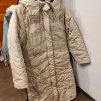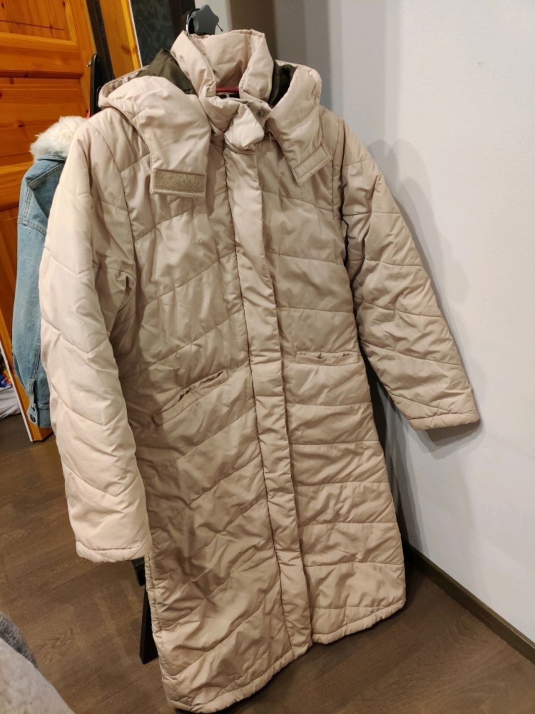 Vaaleanbeige talvitakki. Väri näkyy hyvin ensimäisestä kuvasta. Olen itse 157cm, ja minulle takki yltää hieman polven alapuolelle. Käytän S kokoa, mutta tämä istuu silti hyvin, eikä näytä liian isolta.