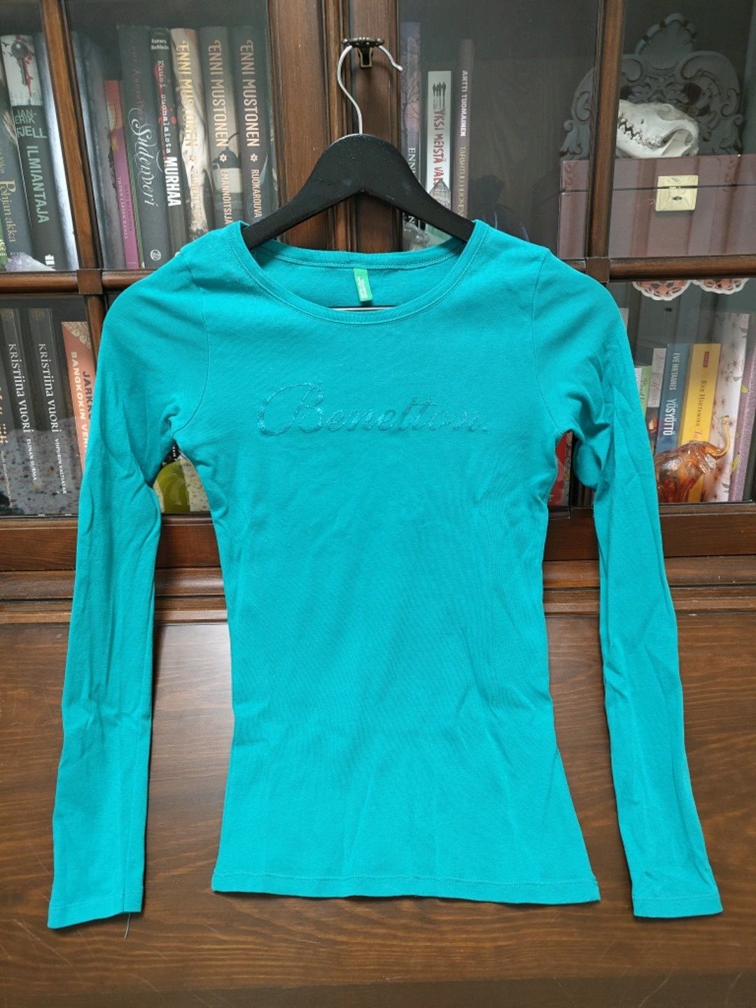 Kokolappu puuttuu, mutta käytän itse kokoa S ja on minulle sopiva. Väri hieman enemmän vihreään taittava kuin kuvissa, mutta on siis sinivihreä. Fontissa pientä kulumaa.