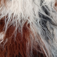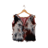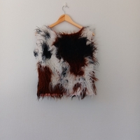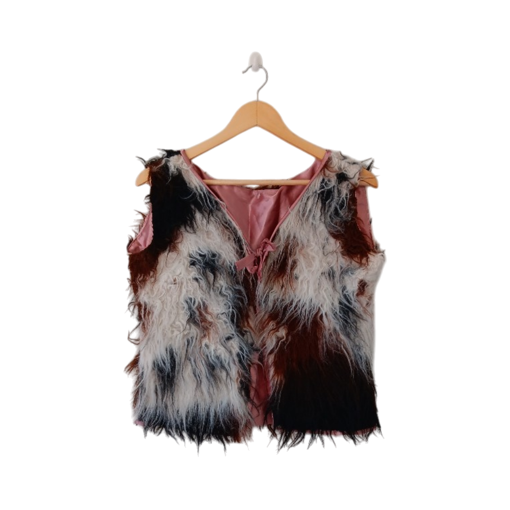 Monivärinen pitkäkarvainen liivi, vuoritettu ja edestä solmittava. Suht viileä päällä. S/m.