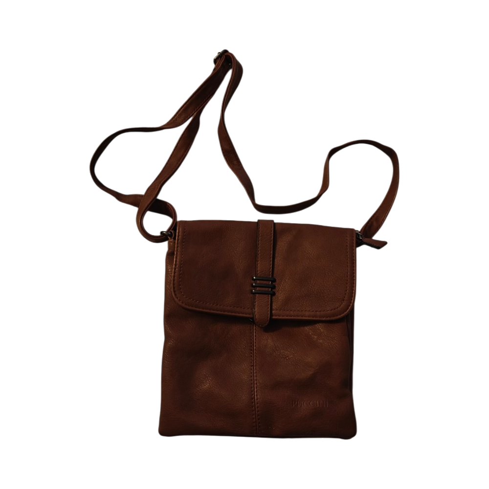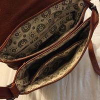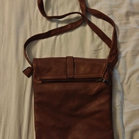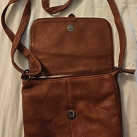 Pieni ruskea crossbody-laukku, useita taskuja ja vetoketju.