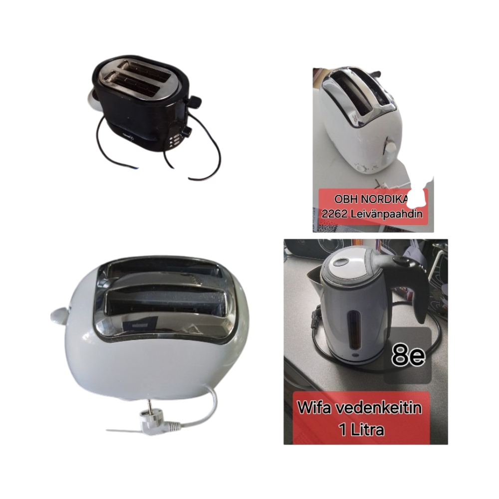 talousvaaka, lasitaso 10e.Vilfa vohvelirauta 6e,Leivänpaahdin ,ideal,Nordika. 2kpl 20e,vedenkeitin 8e. Kaikki toimii hyvin