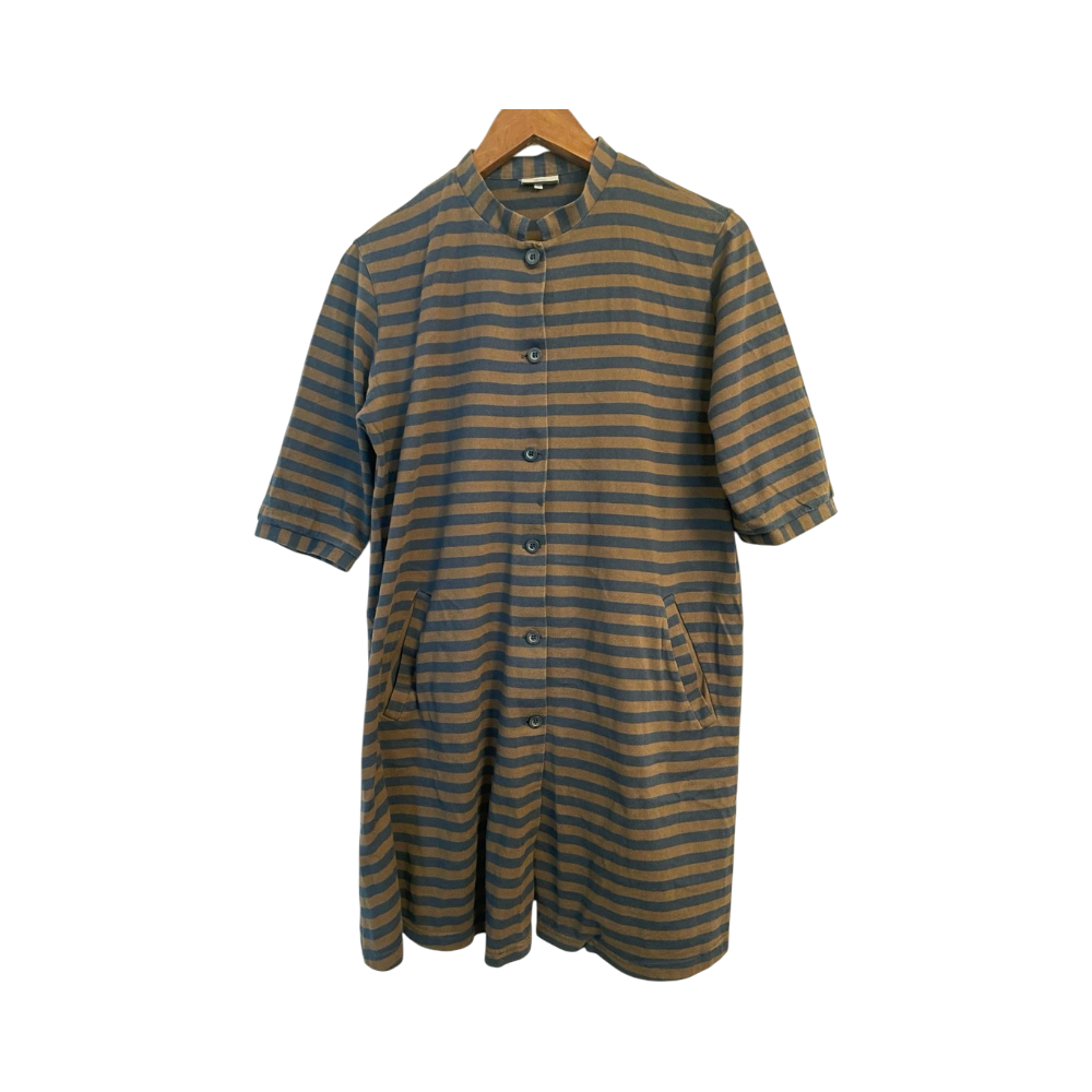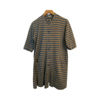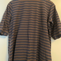 M-kokoinen sini-ruskea raidallinen Marimekon retrotunika. Taskut sivuilla, napitus ja 3/4 hihat. Materiaali 100% puuvillaa. Ehjä mutta käytetty, käytön jäljet näkyvät kuvissa.