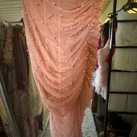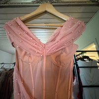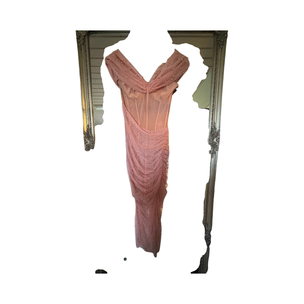 Pitkä korsettimainen mekko helmikoristeilla, sifonkia/tülliä.