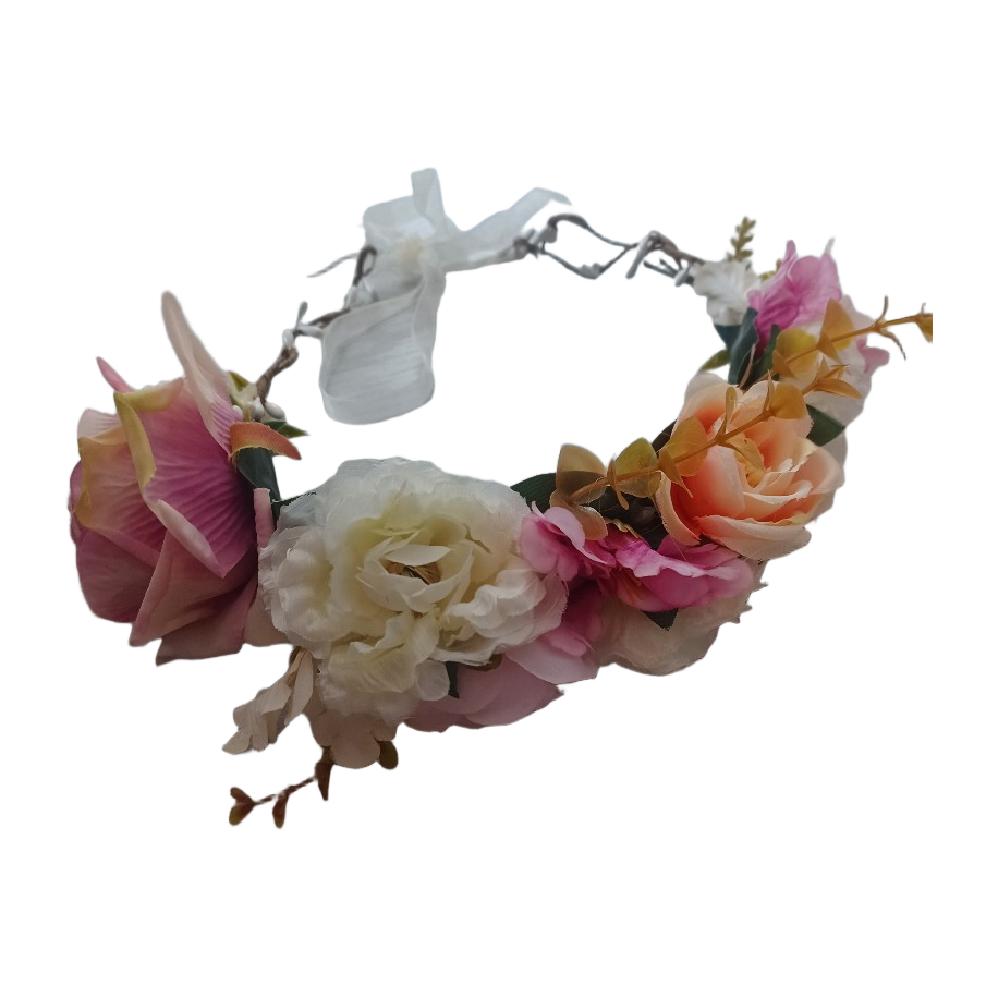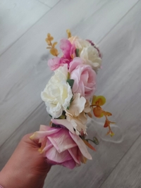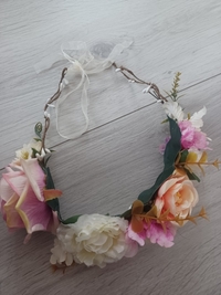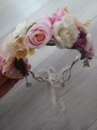 Kaunis kukkaseppele juhliin. Aivan ihana panta jossa paljon isoja kukkia. Sävyltään enimmäkseen vaaleanpunainen/pinkki. Käytetty kerran juhlassa. Ostettu partykingistä bride seppele ja maksoi 19.90e plus postikulut 4.90e. Kuitti kuvissa.