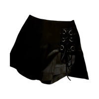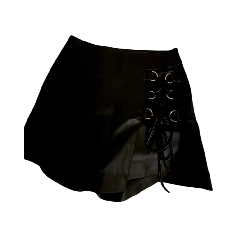 Lyhyt musta hame nauhoilla ja renkaille koristeltu sivu.