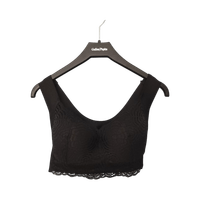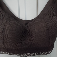 Pehmeä toppaamaton pitsirintaliivi, leveät olkaimet. Ympärysmitta n. 110 cm.