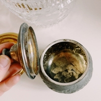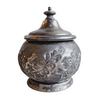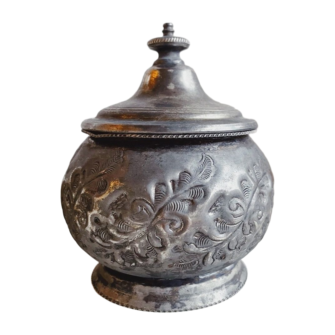 Vanha kaunis koru/ sokeripurkki. Ehkä tinaa. Arabiankielistä tekstiä pohjassa.