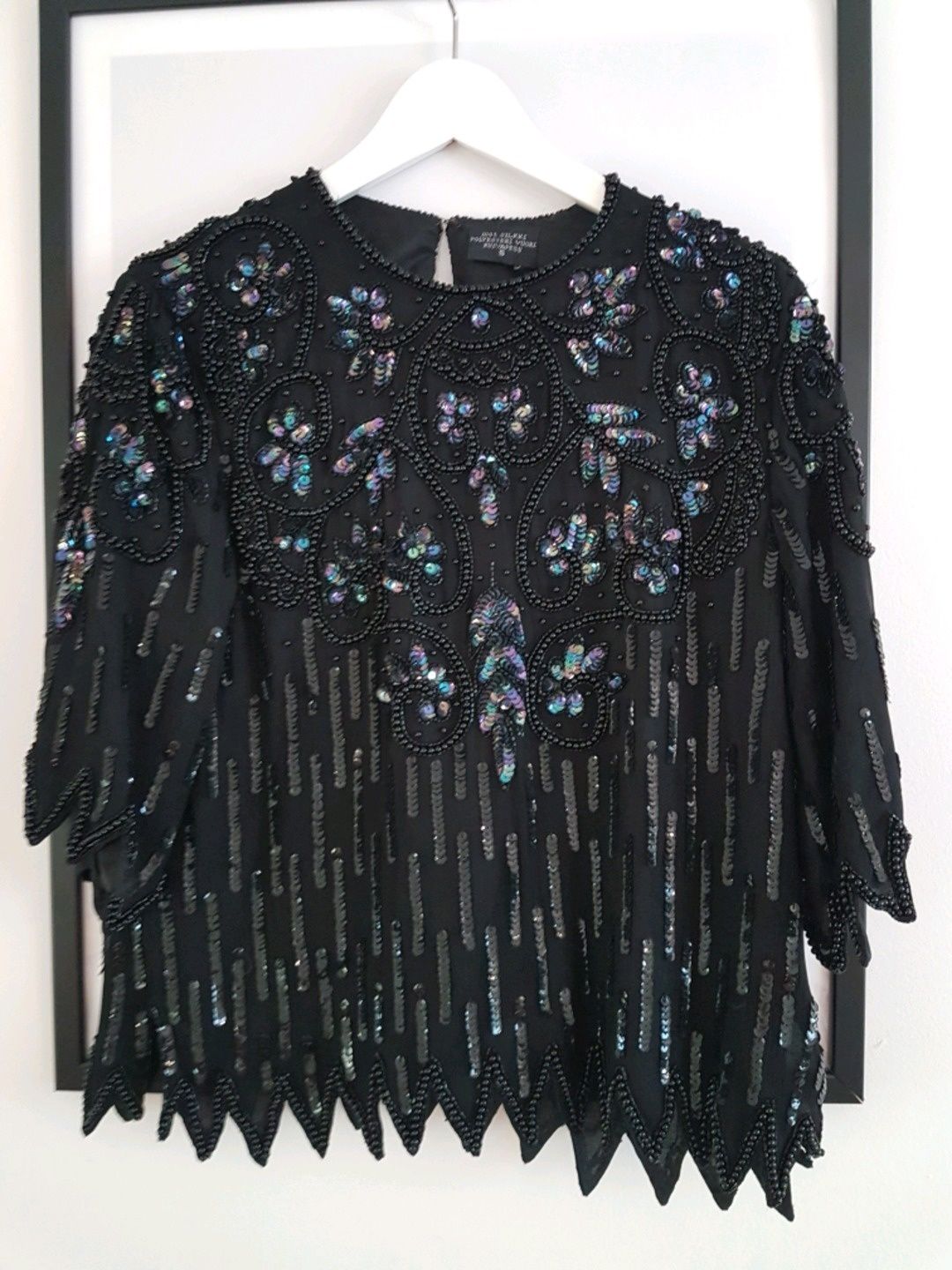 Musta paljetti paita. Menee mielestäni myös M koolle. Silkkiä