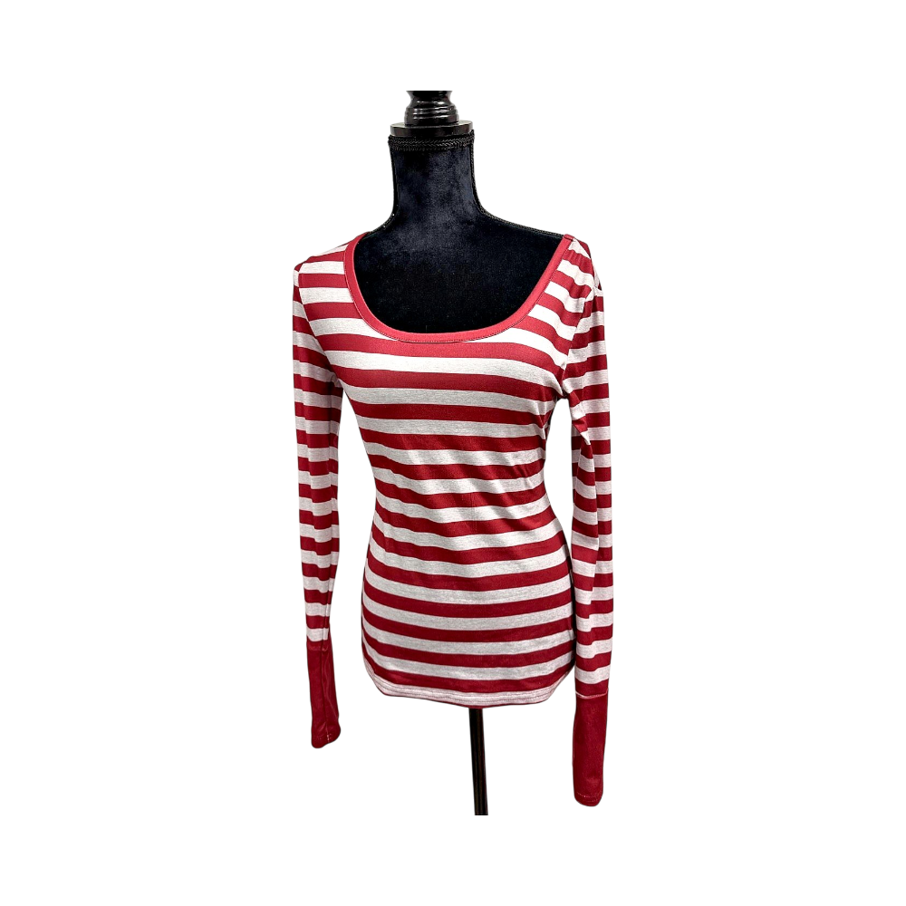 Long-sleeved top with red and white horizontal stripes. Features a scoop neckline.