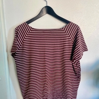 Viininpunainen ja valkoisen raidallinen t-paita. Hyvässä kunnossa, hieman pesunukkaa.