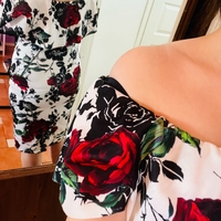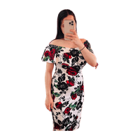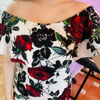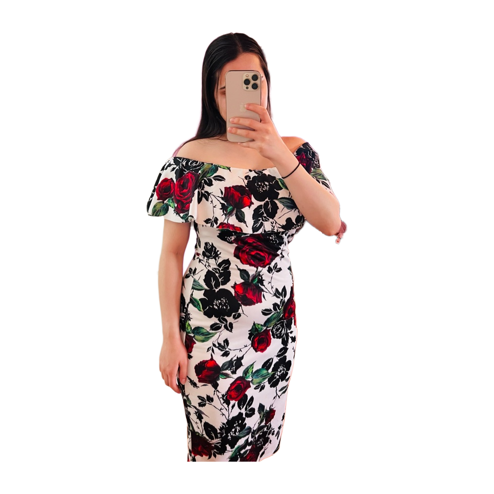 Valkoinen mekko punaisilla ruusukuvioilla, olkapäät paljaana.