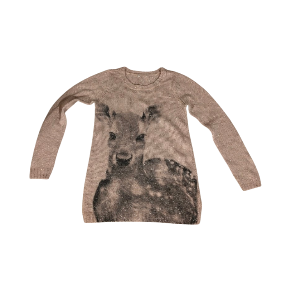 Pitkä neulepaita peura-printillä, sopii arkikäyttöön.