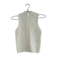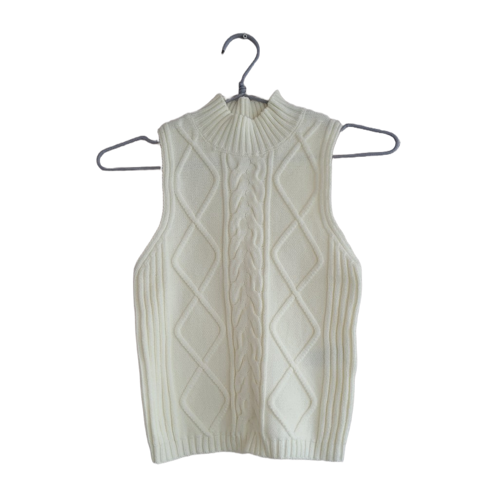 Luonnonvalkoinen hihaton neuletoppi, jossa korkea kaulus 🐑 Käyttämätön, vain kokeiltu päälle. Vikassa kuvassa näkyy pieni lankojen purkautuminen.