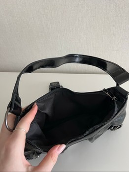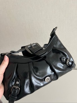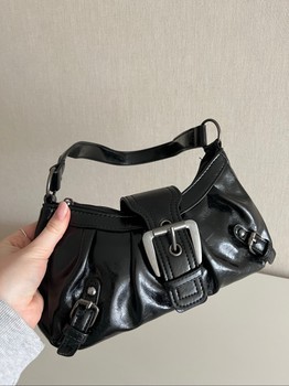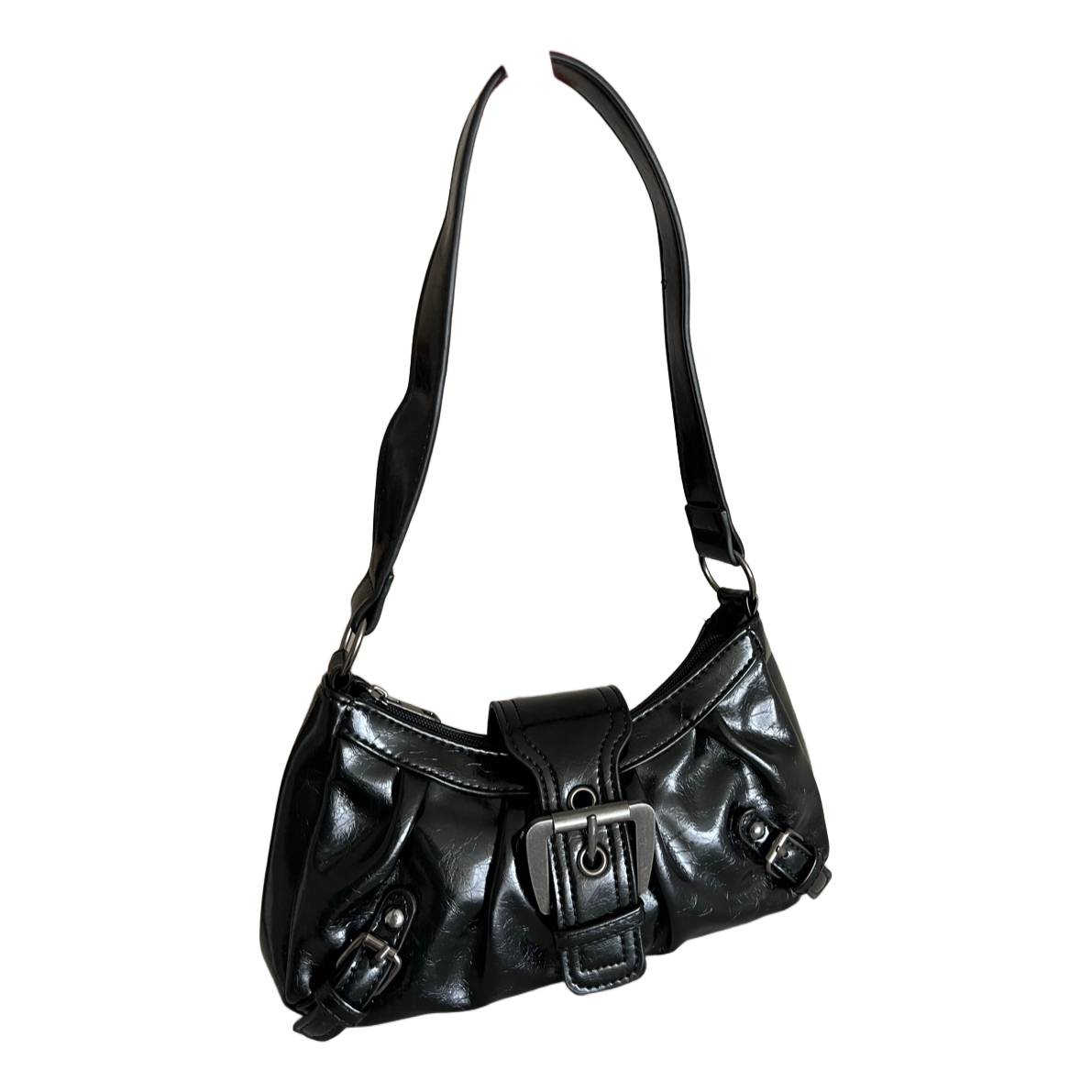 Small black patent leather-look shoulder bag. Features decorative buckles and a zipper closure.