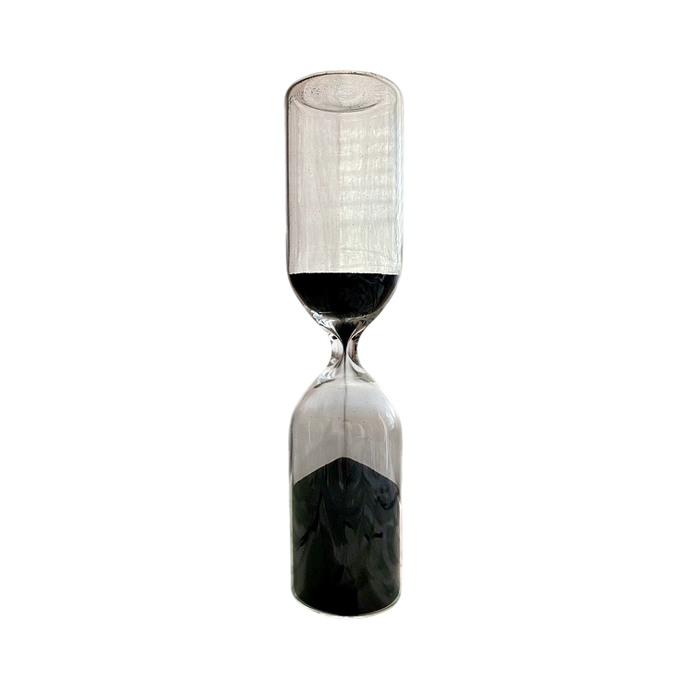 Decorative glass hourglass with black sand, tabletop timer. Duration about 20 minutes, height 25 cm.
