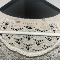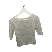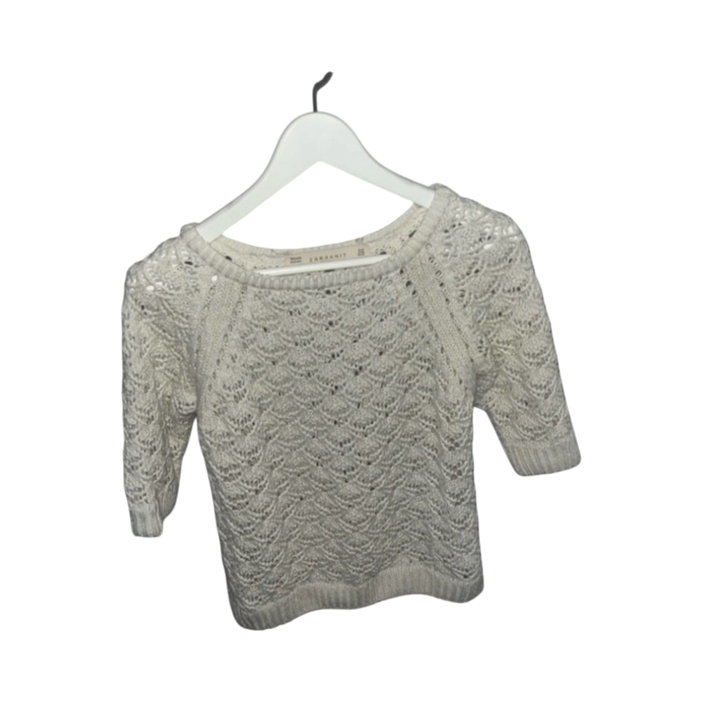 Valkoinen lyhythihainen virkattu neule, kevyt ja siisti.