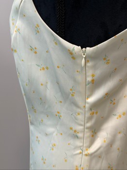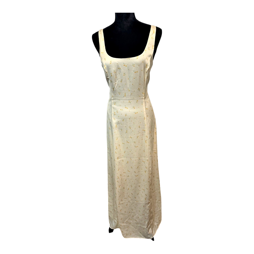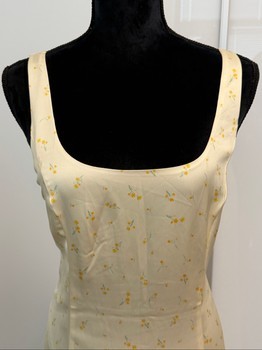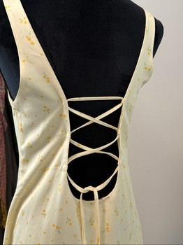 Cream midi dress with a delicate yellow floral pattern. Features a square neckline and a lace-up detail on the back.